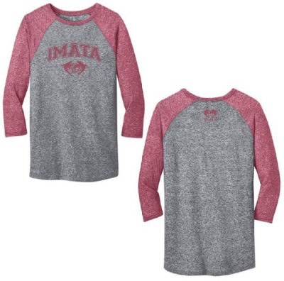 Men's heather red and gray baseball shirt with IMATA block graphic on front in red and small IMATA logo on back at base of neck