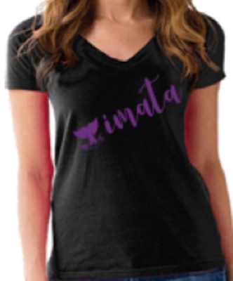 Ladies Black v-neck short sleeve t-shirt with purple fluke and IMATA print on front. Small purple IMATA logo on back.