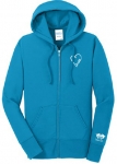 Ladies fit Neon Blue zip-up hooded sweatshirt with white signature heart IMATA graphic on left chest and IMATA logo on sleeve